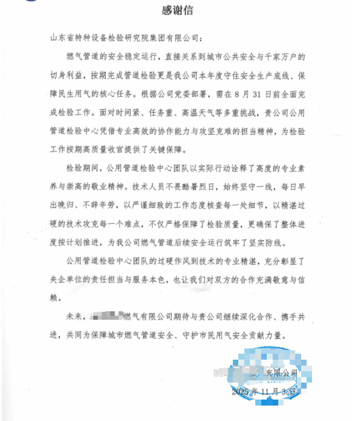 近日,國投檢測省院公司收到一封來自某燃?xì)夤镜母兄x信,對公用管道中心檢驗人員在今年夏季燃?xì)夤艿罊z驗項目中展現(xiàn)的專業(yè)能力、敬業(yè)精神與責(zé)任擔(dān)當(dāng)表達(dá)了高度認(rèn)可和由衷感謝。這封信不僅是對公用管道中心工作的肯定,更折射出其在保障城市公共安全中所發(fā)揮的重要作用。