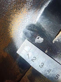 近日,國投省院容器分公司接到濰坊某煉化企業(yè)的報檢申請,對其氣分裝置壓力容器、壓力管道進行定期檢驗,檢驗人員在對脫碳五塔回流罐焊縫進行磁粉檢測時,發(fā)現(xiàn)一處缺陷,宏觀看僅有針孔大小,焊縫經(jīng)打磨至母材齊平后,發(fā)現(xiàn)是制造缺陷-密集氣孔,經(jīng)具有相關(guān)資質(zhì)單位維修人員打磨后,最深處達到7mm。