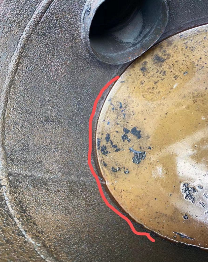 檢驗過程中發(fā)現(xiàn)封頭異常減薄,其壁厚剩余量已不足設(shè)計厚度的一半。商同使用單位打開該設(shè)備后,發(fā)現(xiàn)排污管已無法正常使用,混合氣污油等沉積于封頭底部形成均勻腐蝕。將安全隱患及產(chǎn)生機理迅速反饋至使用單位并建議其立即整改,避免了事故的發(fā)生。